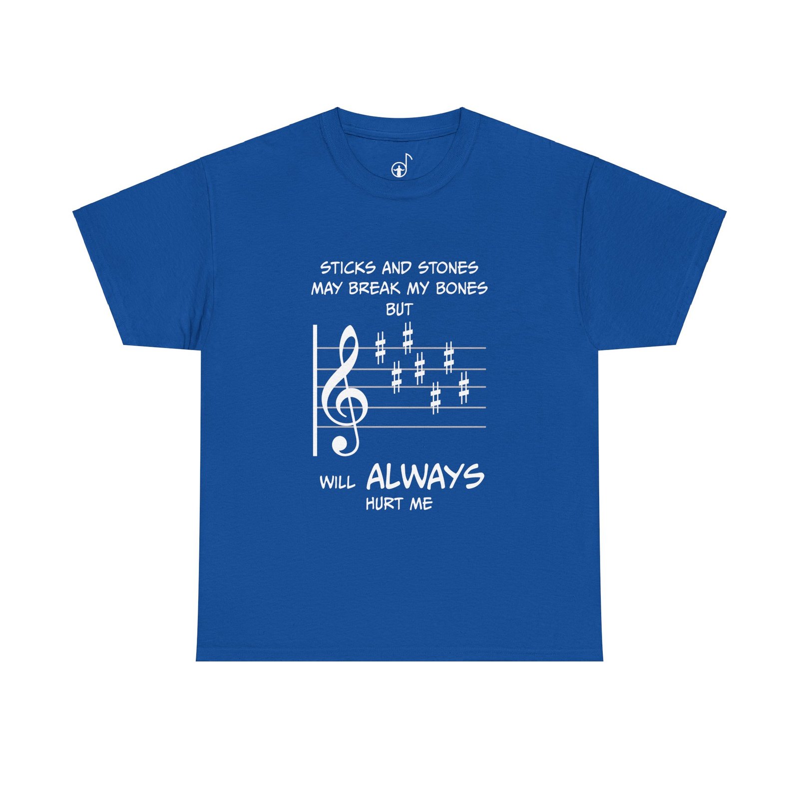 This T-Shirt features a funny musical twist on the ‘sticks and stones’ phrase, with many sharps in the key signature. It adds a touch of humor and creativity to your wardrobe, perfect for music lovers and those with a playful sense of style. Ideal for casual wear or music-themed events and parties. Great for music teachers and students (see below for additional images and sizing chart).