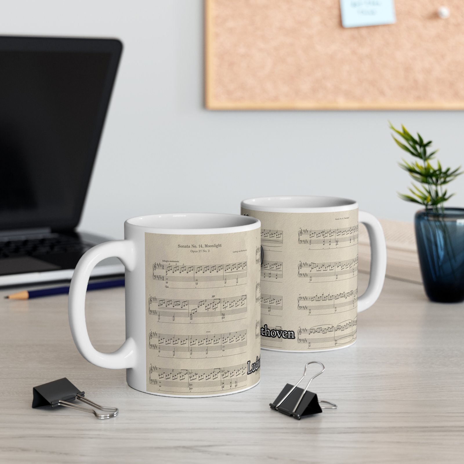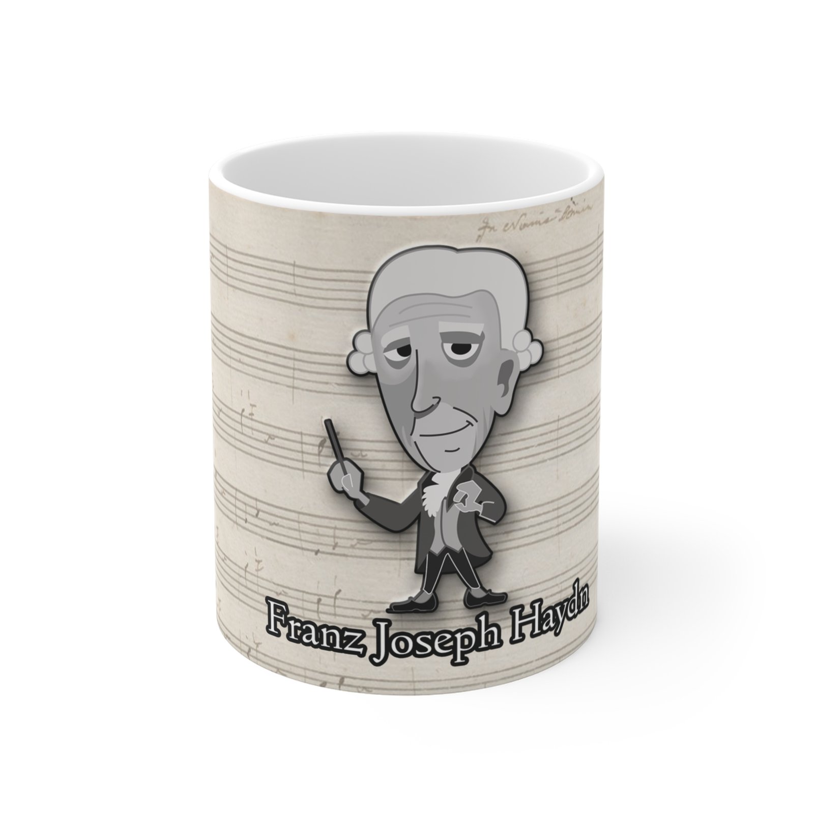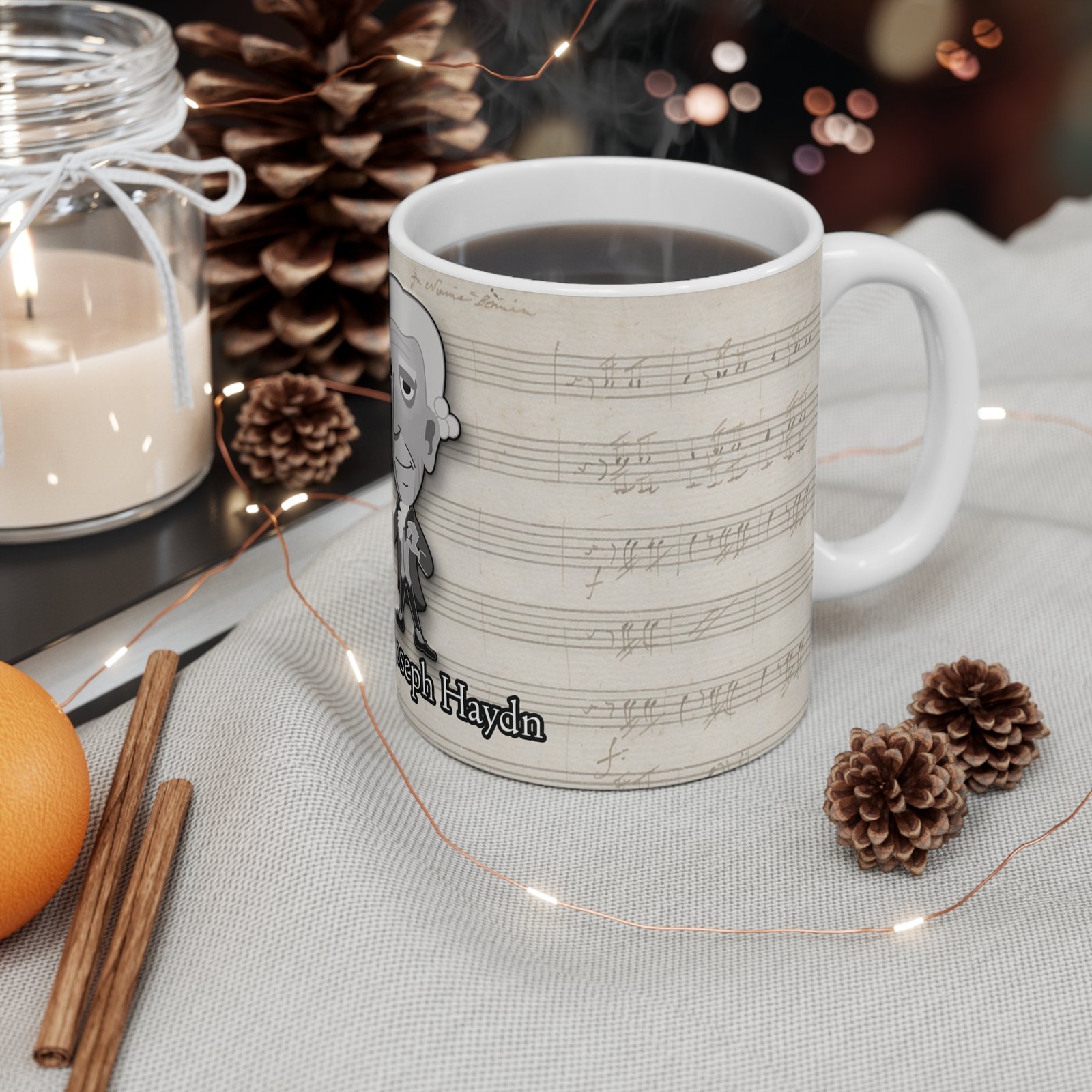Coffee mug featuring the classical composer Franz Joseph Haydn (1732-1809) in front of a his handwritten score for his Symphony No. 82. This design is printed on a white ceramic 11oz mug. Great for music teachers/students and any other music fan! Dishwasher and microwave safe.