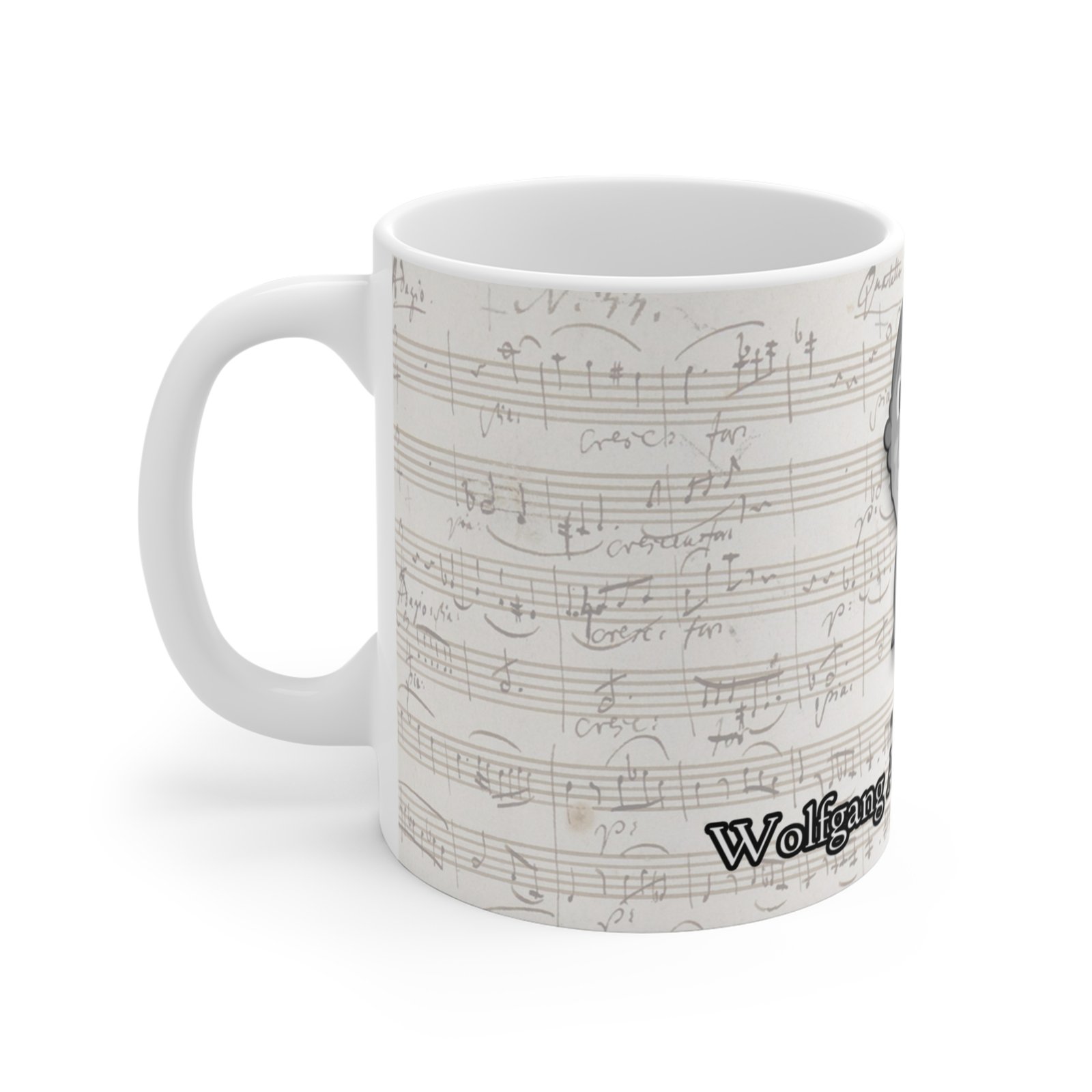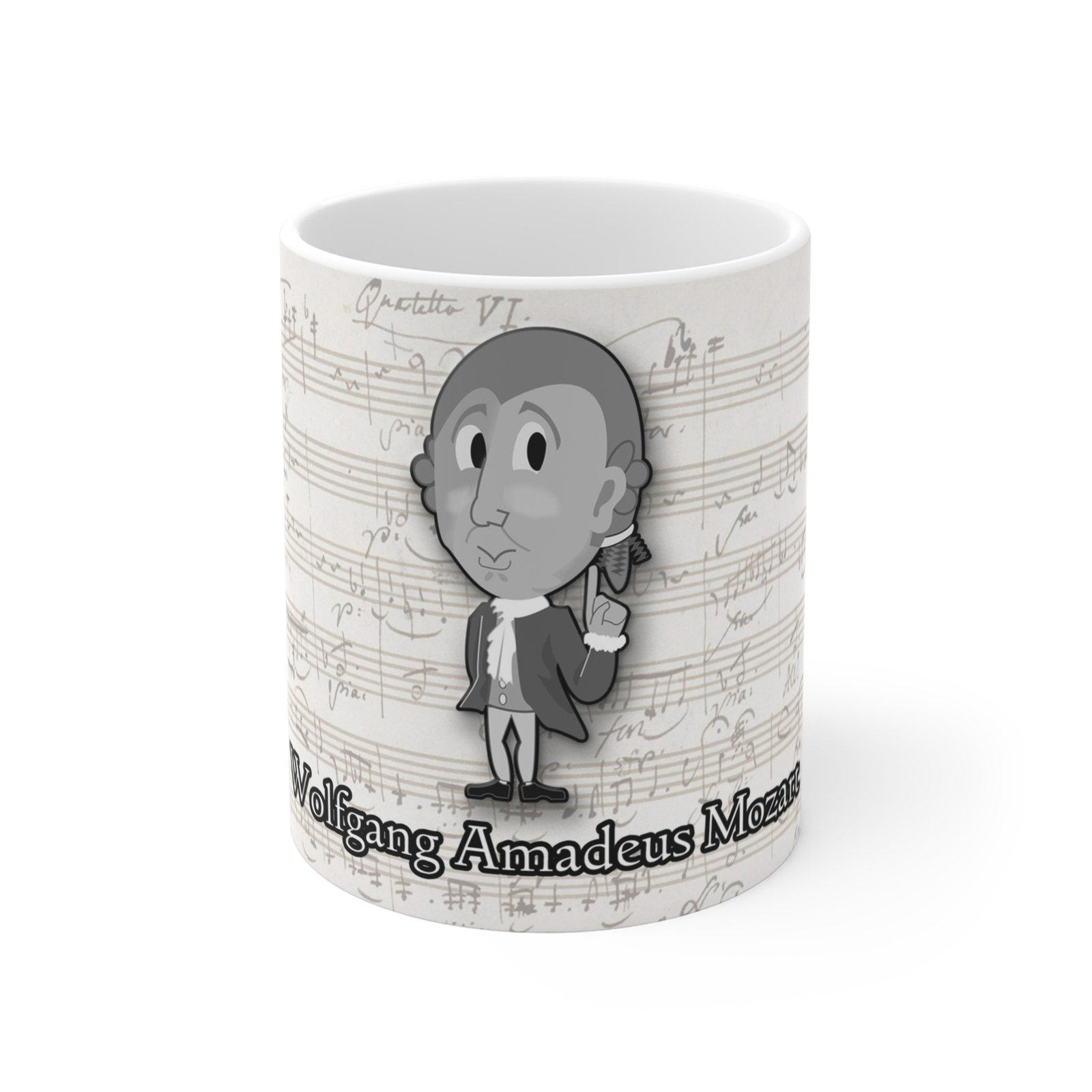 Mozart coffee mug. Design printed on white ceramic 11oz mug. Great for music teachers/students and any other music fan! Dishwasher and microwave safe. Perfect for coffee, tea and hot chocolate, this classic shape white, durable ceramic mug comes in the most popular size. High quality sublimation printing makes it an appreciated gift to every true hot beverage lover.